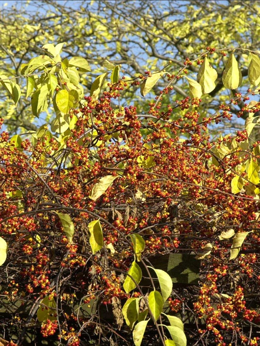 Zu den Besonderheiten des Baumwürgers gehören sicherlich seine unverkennbaren roten Früchte im Herbst, die auch als Vasenschmuck sehr beliebt sind. Im Juni trägt Celastrus orbiculatus unauffällige, zweihäusige, grüne Blüten, die mit ihrer Farbenpracht ab September zum Blickfang in Ihrem Garten werden. In geschlossenem Zustand sind die erbsengroßen Früchte gelb, bei Samenreife platzen diese auf und zieren den Baumwürger mit leuchtenden dunklen orange-roten Samenkapseln, die meist bis in den Winter hinein haften bleiben. Die Blätter des Baumwürgers sind frischgrün, 5-12 cm lang und eiförmig bis rund elliptisch. Im Herbst schmückt sich Celastrus orbuculatus mit einer prachtvollen, gelben Herbstfärbung – ein bemerkenswertes Farbspiel.
