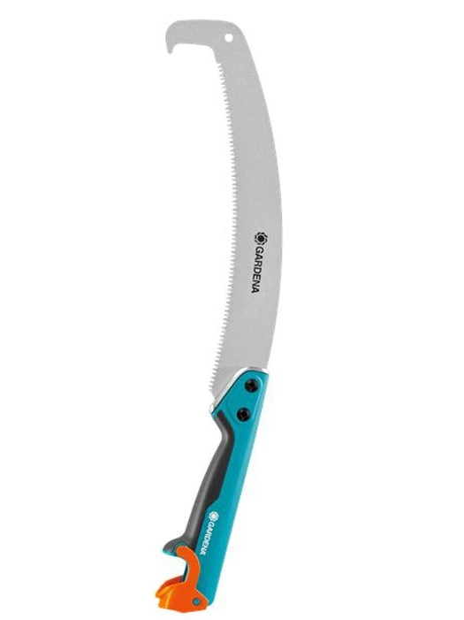 Bei dieser Zug-Druck-Säge sind Sie auch bei ziehenden Bewegungen dank des Stoppers am Griffende abrutschsicher. Mit dem Räumhaken an der Spitze des gebogenen Sägeblatts beseitigen Sie bequem Geäst. Die Säge kann an einer Öse aufgehängt und das Sägeblatt mit einem Schneidenschutz geschützt werden. So ist die cs-Gartensäge stets sicher aufbewahrt.