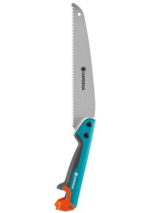Die Säge kann an einer Öse aufgehängt und das Sägeblatt mit einem Schneidenschutz geschützt werden. So ist die cs-Gartensäge stets sicher aufbewahrt.