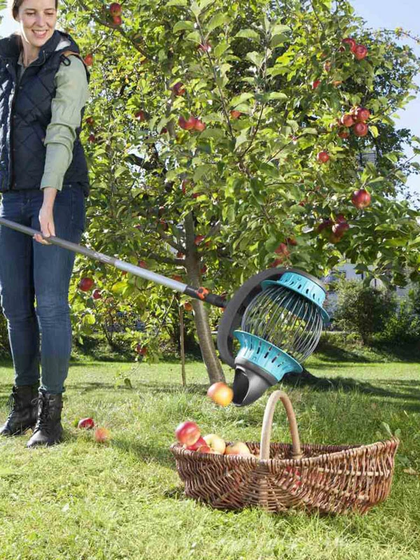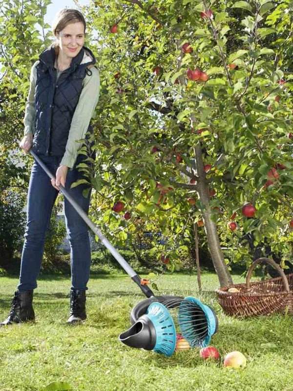 Früchte und Fallobst auflesen ohne Bücken, das ist mit dem GARDENA combisystem Rollsammler ohne Anstrengung möglich. Dank der flexiblen Kunststoffstreben können Früchte verschiedener Größen von 4 bis 9 Zentimeter aufgesammelt werden. Egal ob Walnuss oder Apfel – einfach darüber rollen und schon befinden sich die am Boden liegenden Früchte im Sammelkorb.