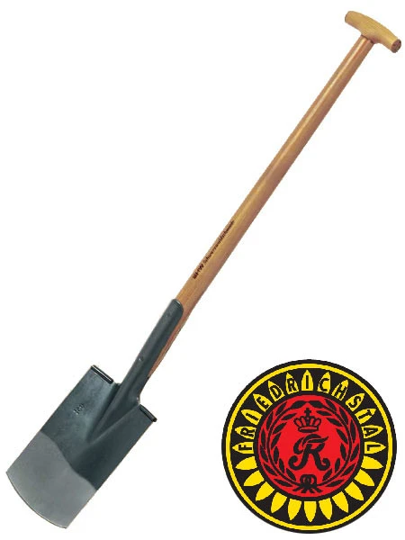 Gärtnerspaten zum Umgraben und Umstechen zur tiefen Lockerung des Bodens. Hochwertiger Eschenholzstiel, geschmiedeter Stahl, Gewicht 2150 g.