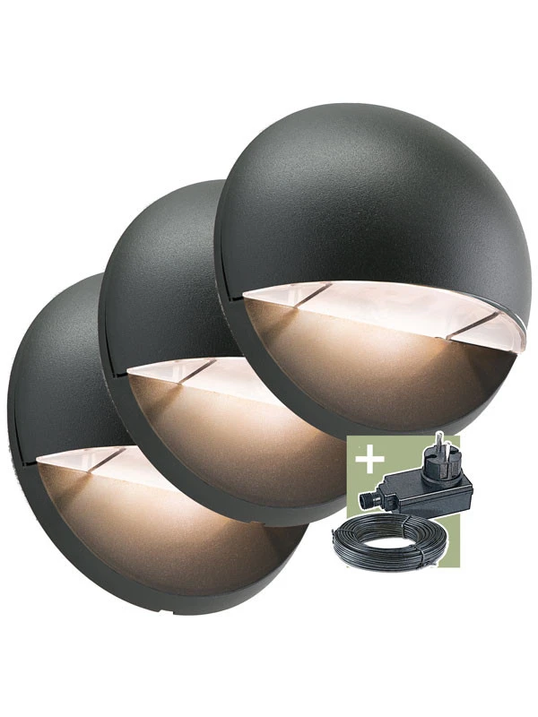 Beleuchten Sie Ihre Wand oder Ihren Gartenweg mit dieser Ludeco Außenleuchte Vidar Starter-Set. Dieses drei Wandleuchten haben jeweils drei integrierten LEDs und sind durch die sichere Spannungsebene von 12 Volt menschen- und tierfreundlich. Die dezente und minimalistische schwarze Lampe leistet 90 Lumen. Das Starterset besteht neben den 3 Vidar-Lampen aus einem Trafo und einem 8 Meter langen Kabel.