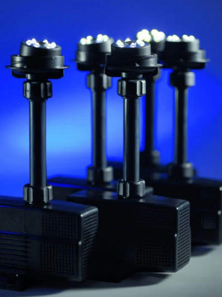 | Fernbedienung Die im Lieferumfang enthaltene Fernbedienung hat eine Reichweite von bis zu 80 m. | Externe Steuerung Die Steuerungseinheit ist leicht anzuschließen und beinhaltet einen Transformator sowie einen Erdspieß. | Beleuchtete Düsen Die individuell angesteuerten Düsen sind einfach auszurichten und leuchten in angenehmem Weiß. | Höhenverstellbar Water Trio und Water Quintet sind höhenverstellbar, so dass der Wasserstand um 15 cm variieren kann. |